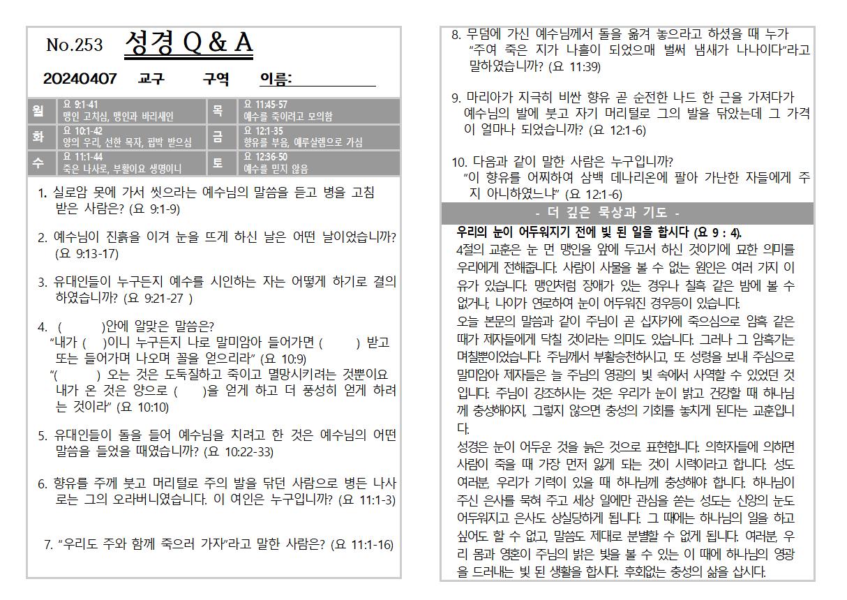 2024년 3월 31일 교회소식 및 Q&A