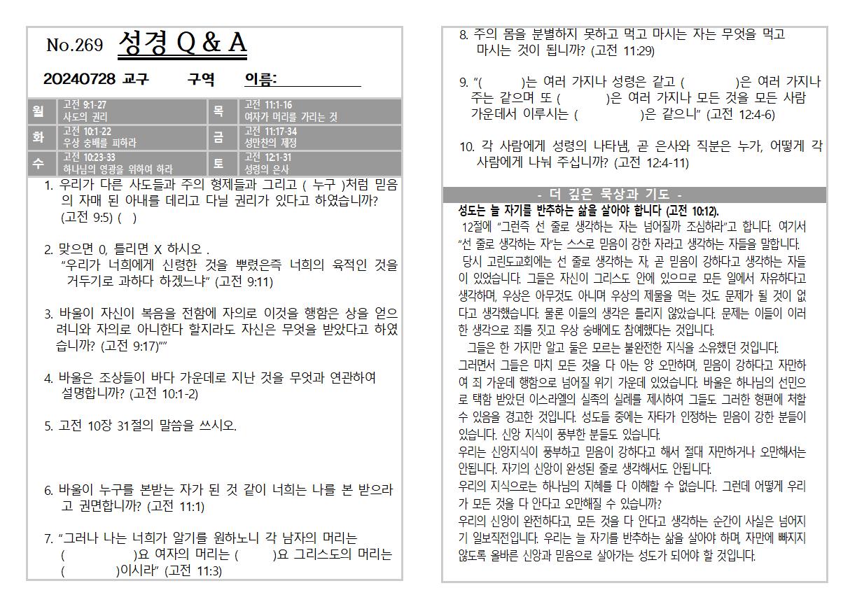 2024년 7월28일 교회소식 및 Q&A