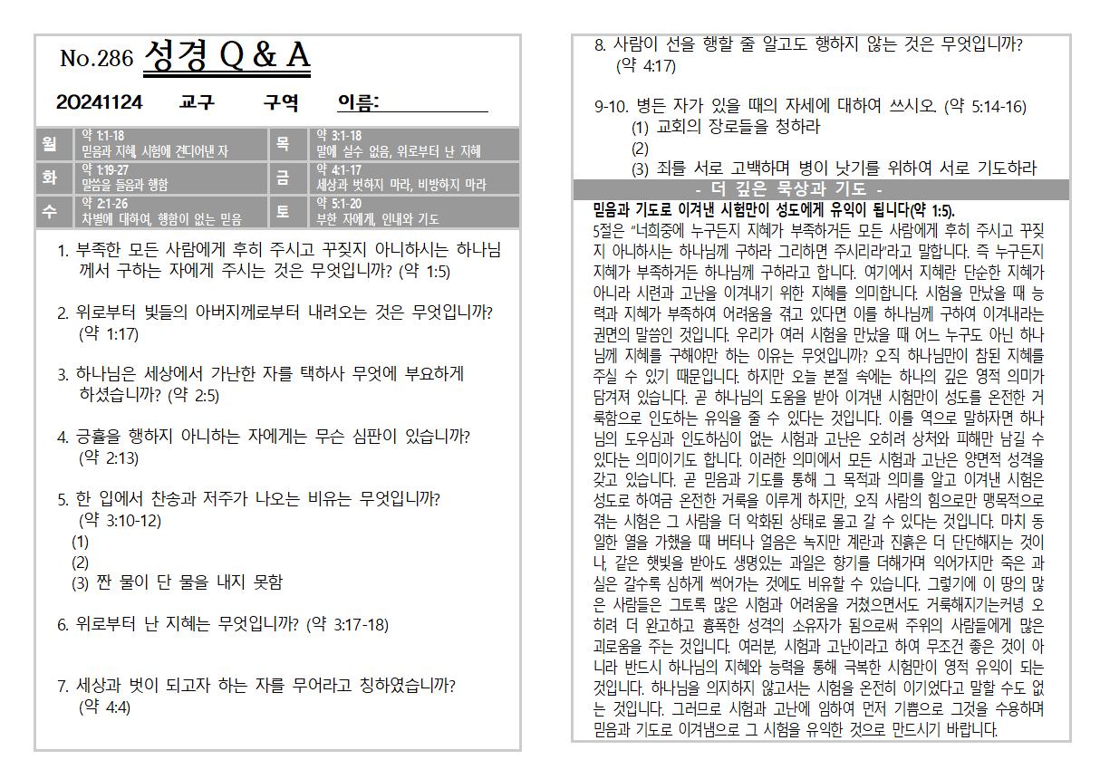 2024년 11월 17일 추수감사 주일 교회소식 및 Q&A
