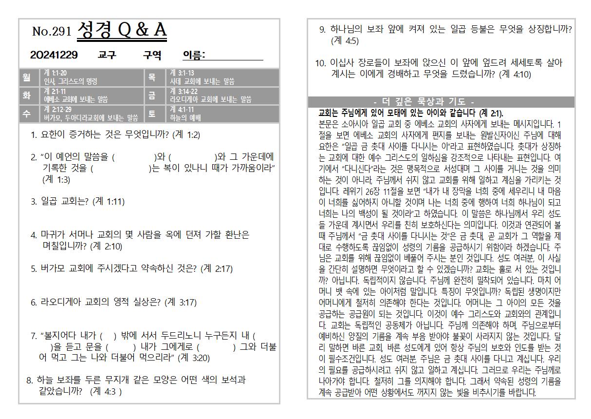 2024년 12월 29일 주일 교회소식 및 Q&A