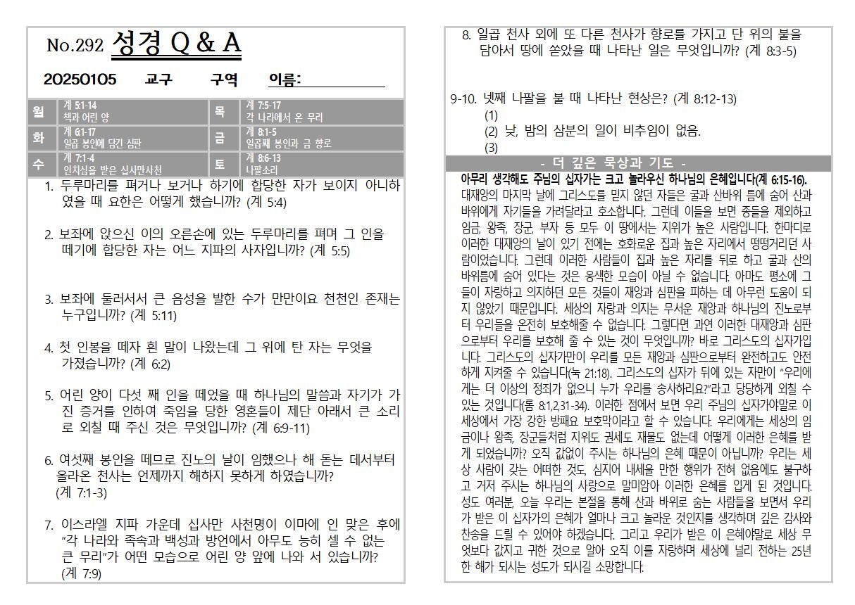 2025년 1월12일 주일 교회소식 및 Q&A