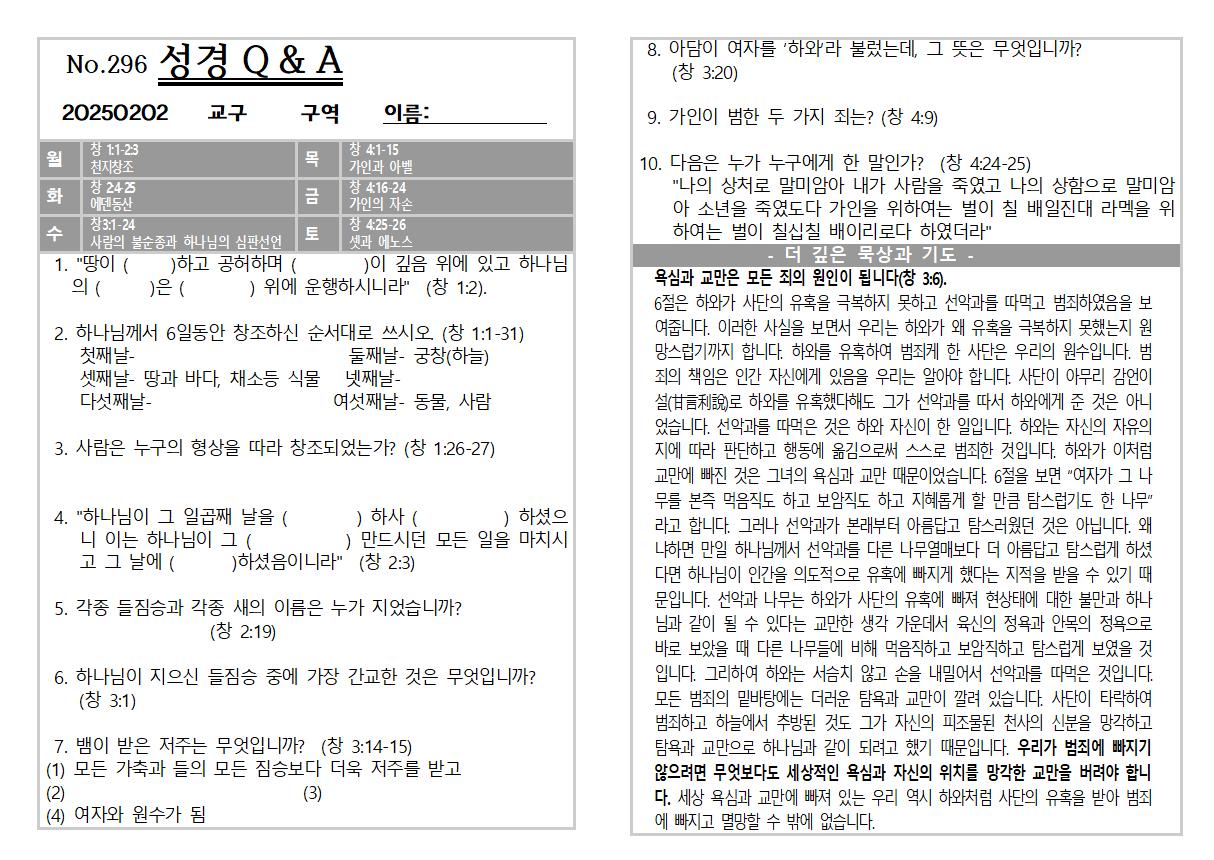 2025년 2월 9일 주일 교회소식 및 Q&A