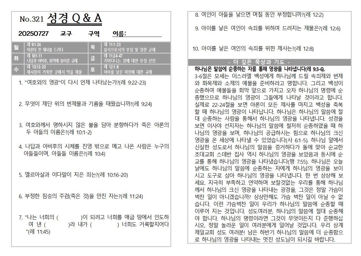 2025년 7월 27일 주일 교회소식 및 Q&A