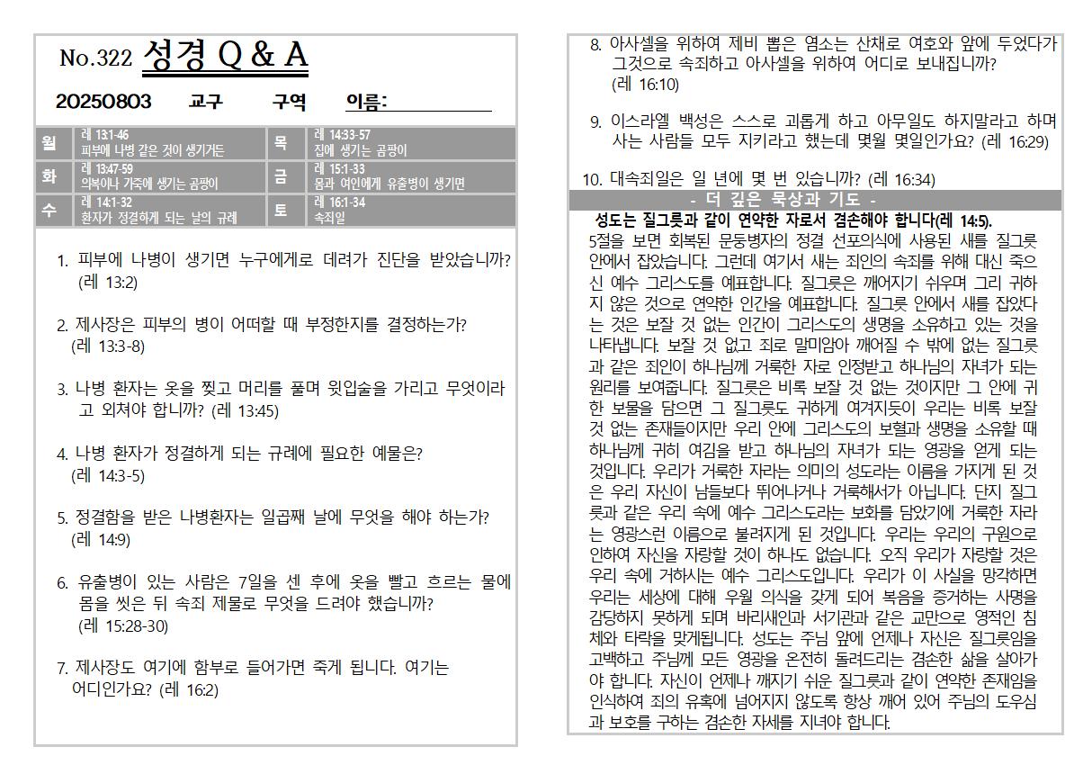 2025년 8월 3일 주일 교회소식 및 Q&A