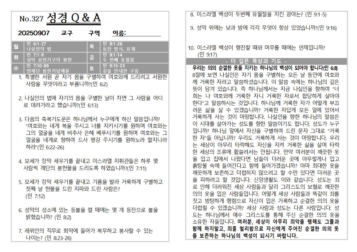 2025년 9월 7일 주일 교회소식 및 Q&A