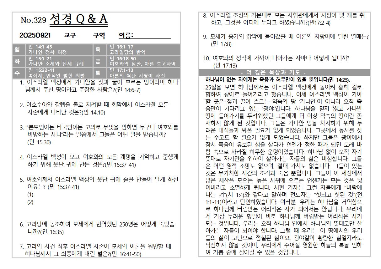 2025년 9월 21일 주일 교회소식 및 Q&A