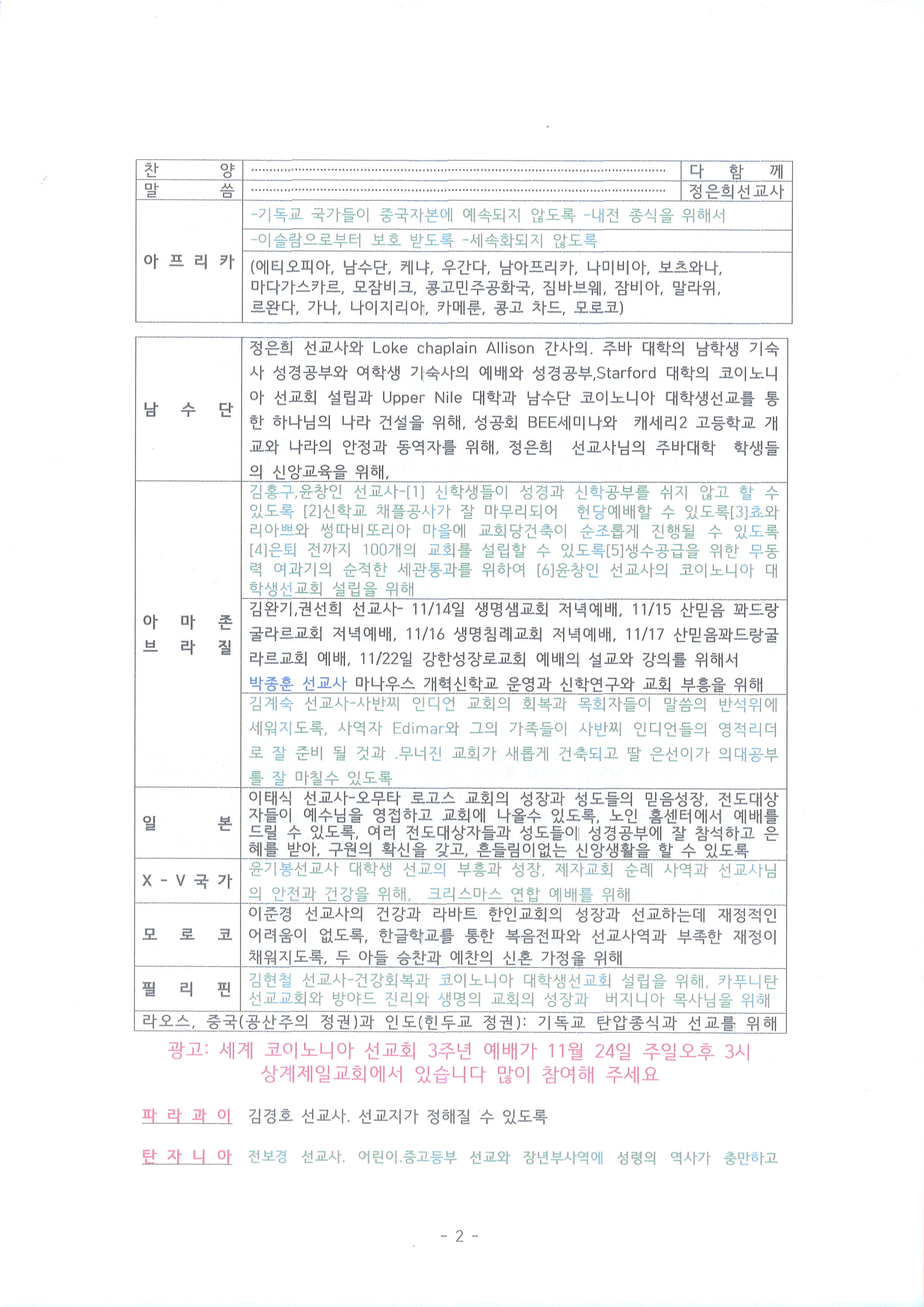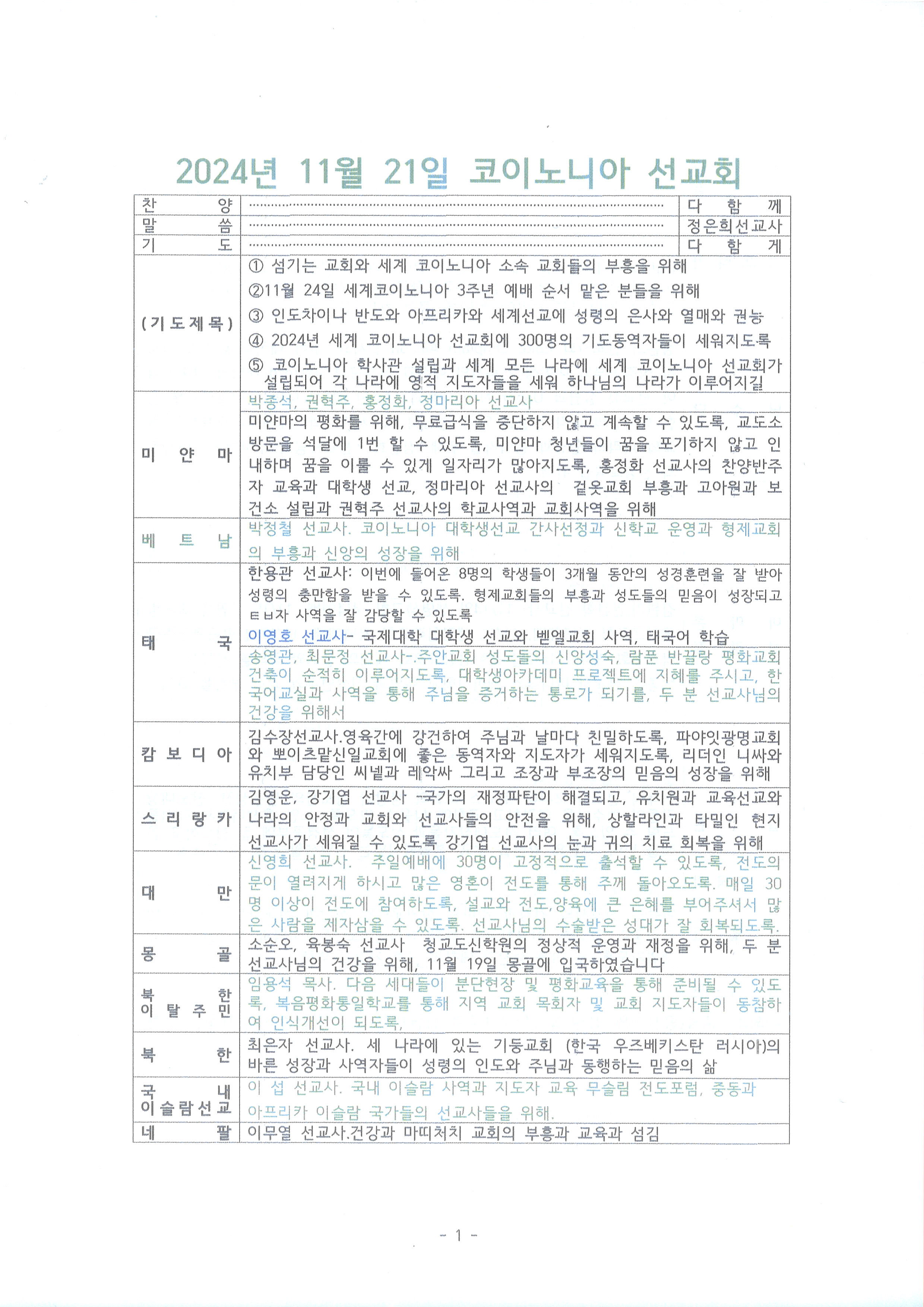 2024년 11월 21일 코이노니아 선교회 각 교회 기도 제목입니다. 각 선교지와 선교사님을 위해 기도해 주시기 바랍니다.