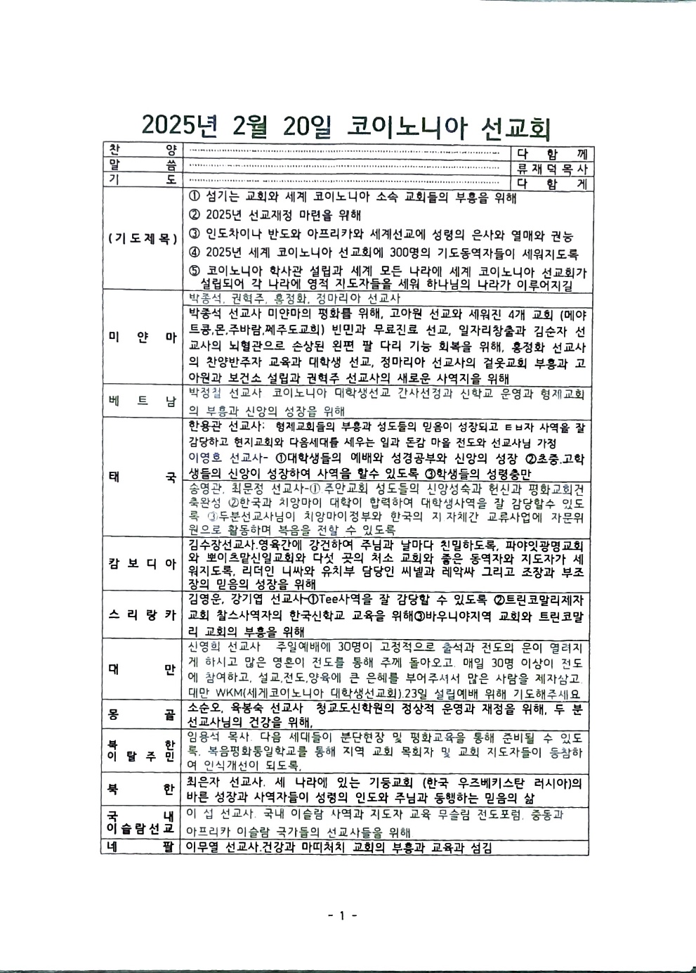 2025년 1월 16일 코이노니아 선교회 기도제목