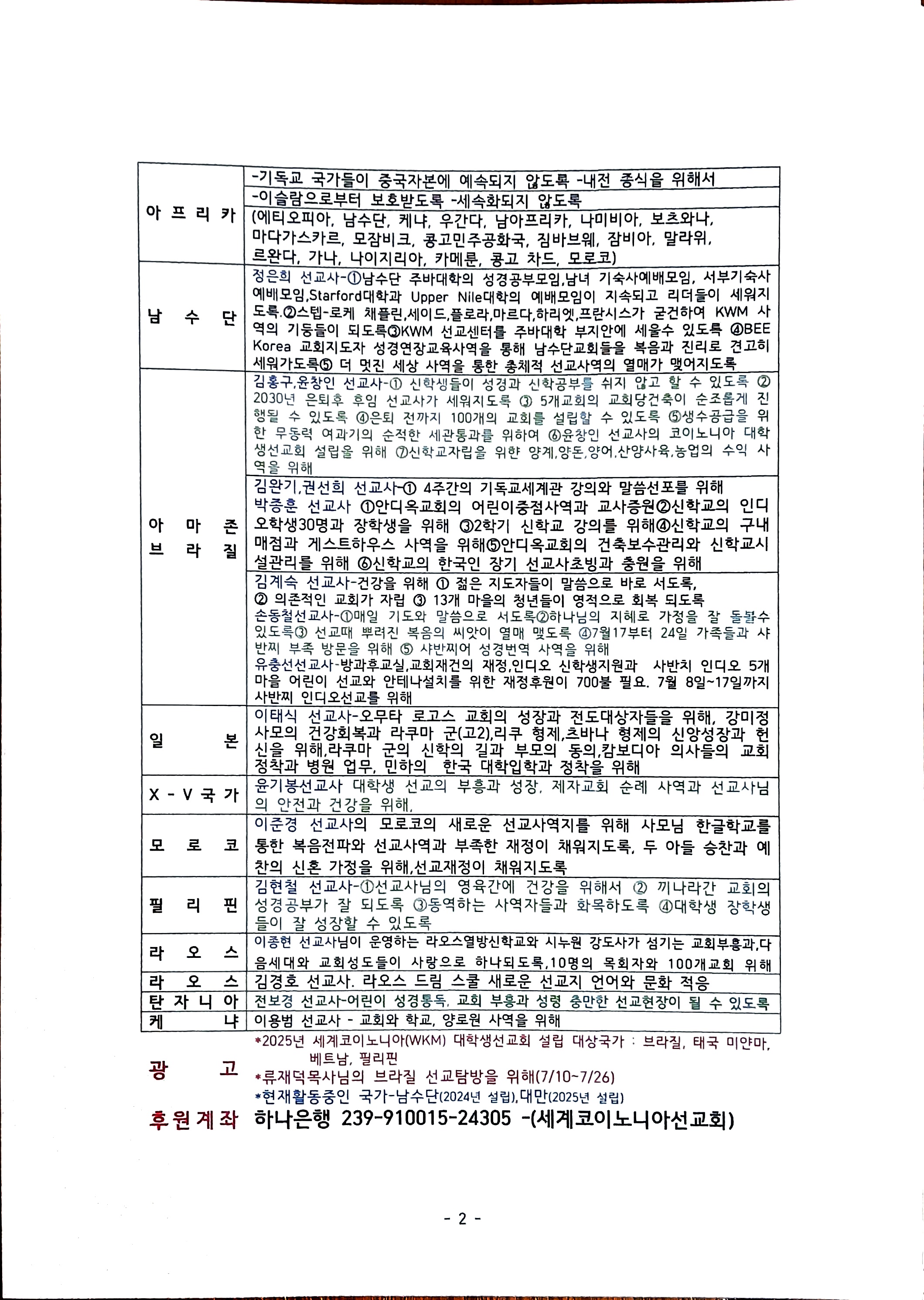 2025년 7월 10일 세계코이노니아선교회 기도제목